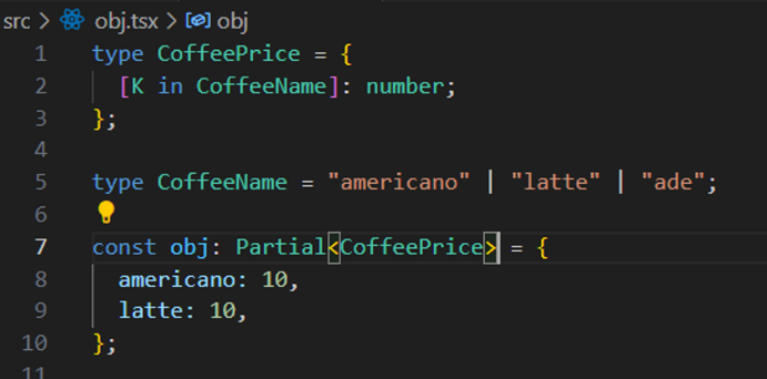 // ~~~ error Property 'ade' is missing in type '{ americano: number; latte: number; }' but required in type 'CoffeePrice'.ts(2741