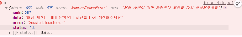 - 세션에러라면 사용자에게 커스텀 에러에 맞는 토스트 메세지를 띄우고 커스텀 에러정보를 반환합니다.