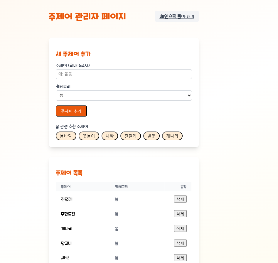 - 주제어를 관리할 수 있는 관리자 페이지를 만들어 달랬더니 이렇게 만들어 줬습니다.