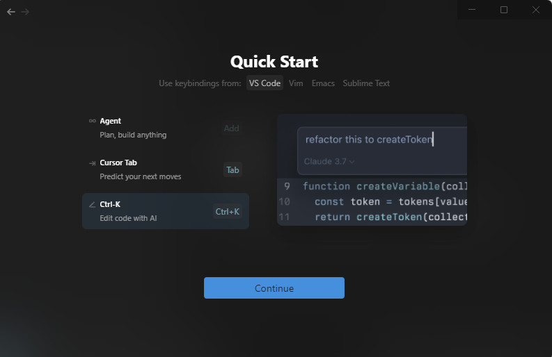 - VScode와 유사한 에디터, 그러나 바로 오른쪽에 Agent 채팅 창이 있어요