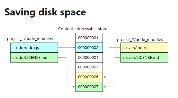 - 내부적으로는 node_modules에 심볼릭 구조를 만들지만, 실제는. pnpm/store에 있는 전역파일을 하드링크로 연결한다.