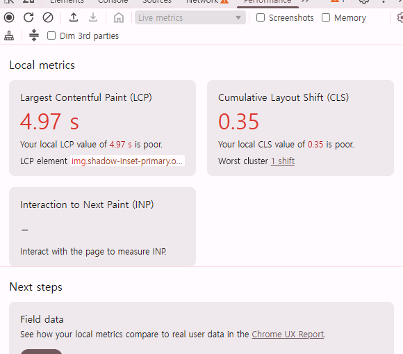- 로딩페이지의 LCP 최대 콘텐츠 페인트 속도가 약 5초로 Core Web Vitals 기준 Poor(매우구림) 수준이었다.
